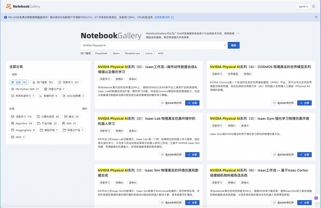 阿里云人工智能平台 PAI 将集成 NVIDIA Isaac Sim、NVIDIA Isaac Lab、NVIDIA Cosmos、Physical AI 数据集在内的全套 Physical AI 软件栈,结合阿里云大数据AI平台在规模化数据计算、模型训练推理、大数据AI一体化开发方向的能力,形成覆盖数据预处理、仿真数据生成、模型训练评估、机器人强化学习、仿真测试在内的全链路平台支撑,让 Physical AI 领域的开发者充分享受云的弹性与灵活,加速创新落地。
