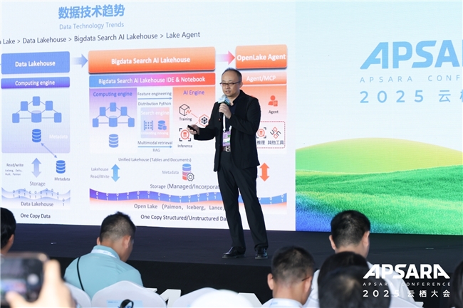 阿里云智能集团计算平台事业部产品负责人徐晟详解阿里云大数据与人智能产品线的新功能发布及阿里云OpenLake 解决方案。Agentic AI时代的数据架构演进中阿里云推出了以 OpenLake 为核心的大数据搜索AI一体的全模态数据湖仓解决方案,通过DLF在统一开放的湖仓上实现了结构化、半结构化、非结构化数据的统一存储与管理,通过所有计算引擎的湖仓升级支持一份数据多个计算引擎(MaxCompute、Hologres、Flink、EMR、PAI、AI搜索等)协同计算,使得湖仓成为Data 和AI 的共同底座。同时通过DataWorks提供的 OpenLake Studio 可对大数据和AI任务的开发和发布提供一体化开发体验以及Agent形式的服务支持。阿里云大数据AI产品线人工智能平台PAI、MaxCompute、Hologres、DataWorks、AI搜索、E-MapReduce、Flink、DLF等产品发布多项能力升级,不仅进一步提升了产品的性能与功能,还优化了用户体验,助力企业更高效地实现数据价值挖掘与AI应用落地。无论是数据处理、存储、分析,还是模型训练与推理,阿里云大数据AI平台都在持续创新,为企业提供更强大的技术支撑,推动数字化转型与智能化升级。
