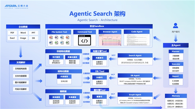 演讲中邢少敏详细阐释了阿里云AI搜索的核心突破——Agentic Search架构创新。该架构通过多Agent协同、多模态数据处理与任务自主规划,构建了从“问题提出”到“方案自主生成”的智能闭环。