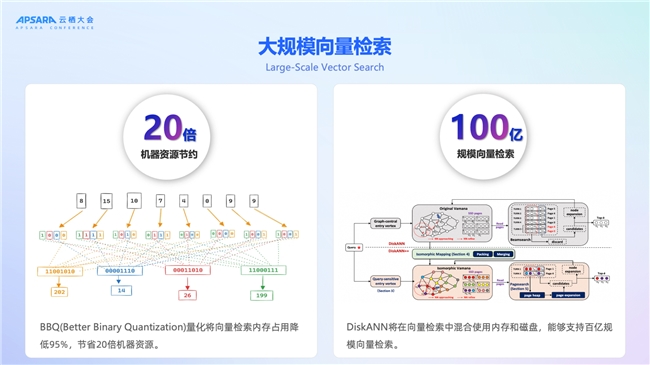 向量检索进化:向量检索GPU加速,基于高性能GPU卡的索引构建性能提升13倍,资源成本下降5倍;结合BBQ量化技术,内存占用降低95%,支持百亿级向量检索;