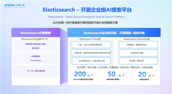 Elasticsearch高性能检索引擎:通过CPU向量化计算、存算分离架构,复杂查询性能最高可提升6倍,存储成本降低50%,支持文本、日志、向量、时序等混合检索场景;