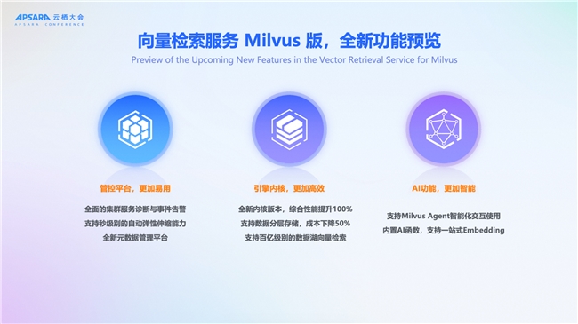 b.内核性能提升100%,支持百亿级数据湖检索,集成Milvus Agent实现智能化交互。